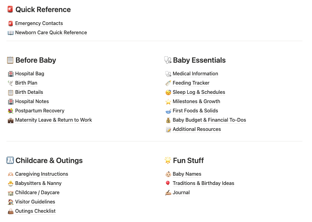 So I did what I always do at work: I built a system. One place for all of it — the pediatrician info, the caregiver instructions, the return-to-work plan, the sleep schedules, the first foods, all of it.